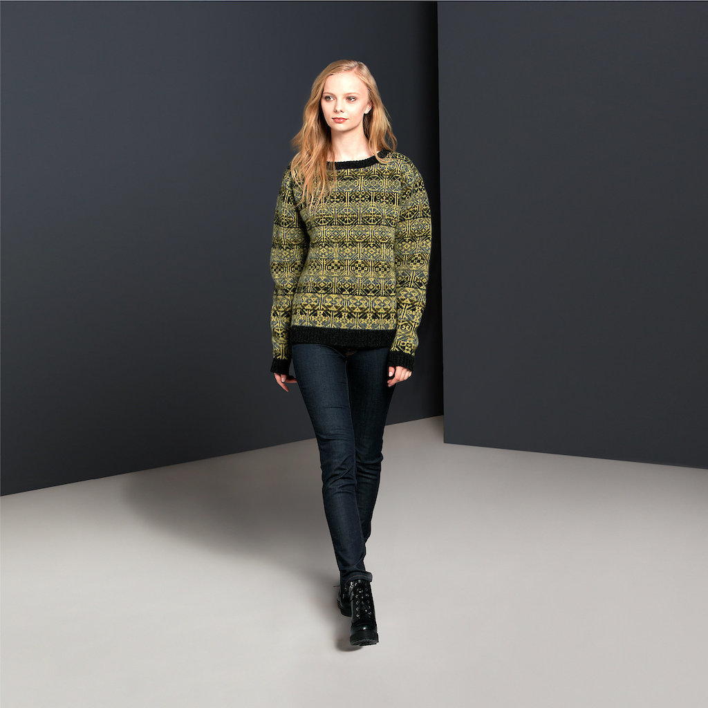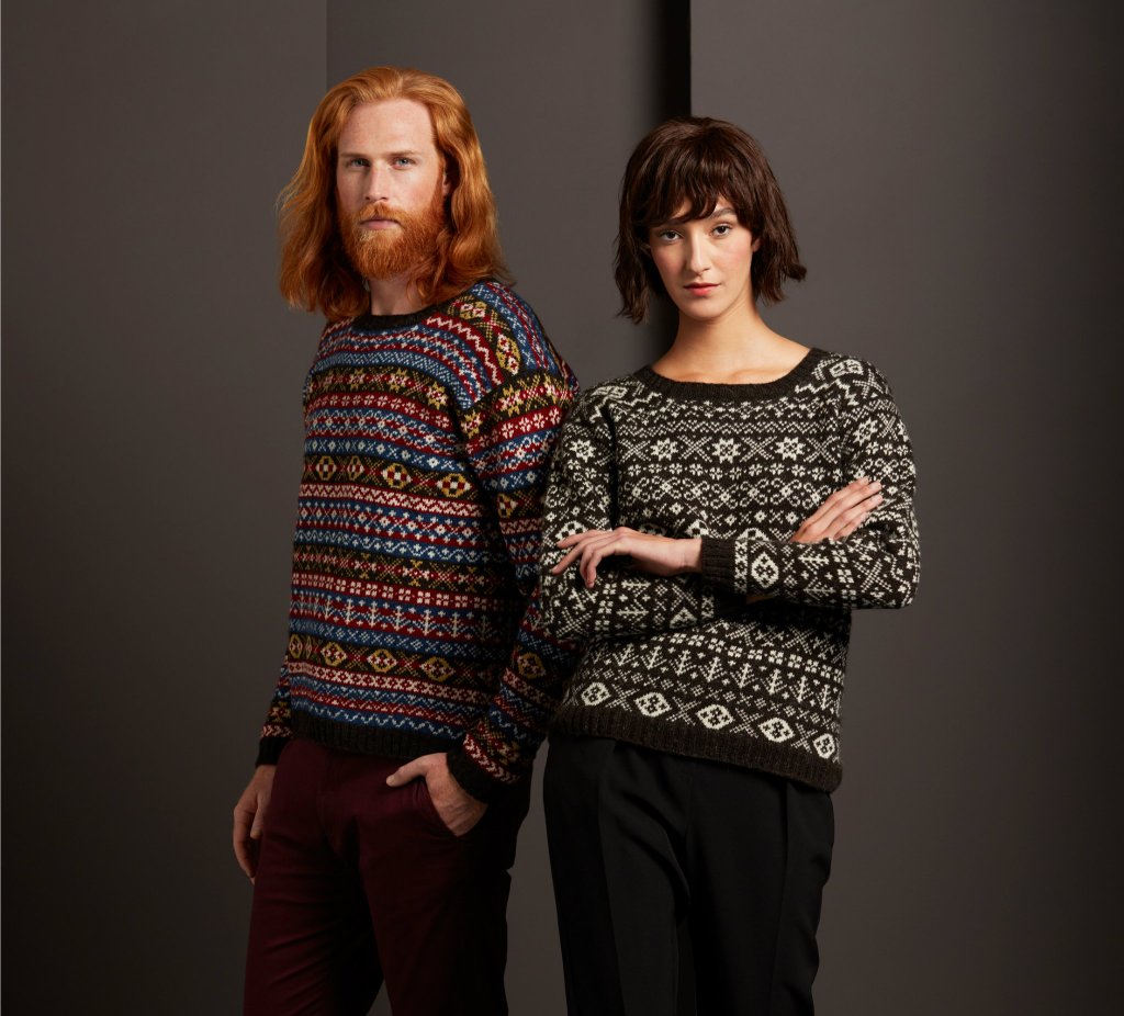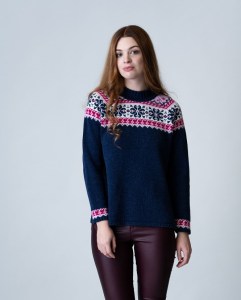 Cette ancienne architecte originaire du Venezuela s’est mise en tête de faire revivre au début des années 2010 les techniques de tricot historiques des Shetlands depuis Faire Isle. Les motifs s’inspirent de dessins originaux des années 1850 avec de la laine des Shetlands filée sur des machines des années 1960. Il existe également une gamme un peu moins onéreuse fabriquée en Angleterre toujours à partir de laine Shetland (photo de droite).